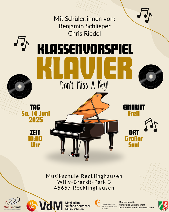 Am Samstag, den 14. Juni 2025 um 10:00 Uhr laden die Klavierschüler:innen von Benjamin Schlieper und Chris Riedel herzlich zum Klassenvorspiel Klavier ein. Das Konzert findet im Großen Saal der Musikschule Recklinghausen (Willy-Brandt-Park 3, 45657 Recklinghausen) statt.