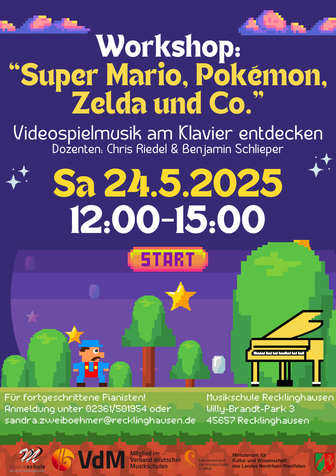 Wir starten mit einem Blick in die musikalische Overworld der Videospiele: Wie ist die Musik in Spielen wie Super Mario, The Legend of Zelda oder Pokémon aufgebaut? Wie hat sie sich entwickelt, von 8-Bit-Symphonien bis hin zu epischen Orchesterwerken? Und vor allem – wie lässt sie sich am Klavier umsetzen?