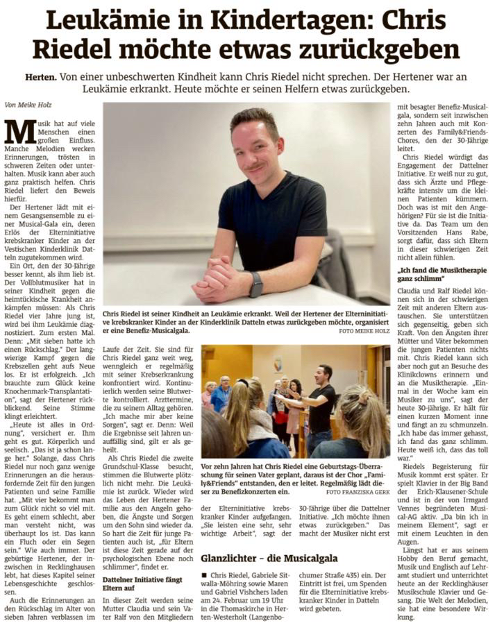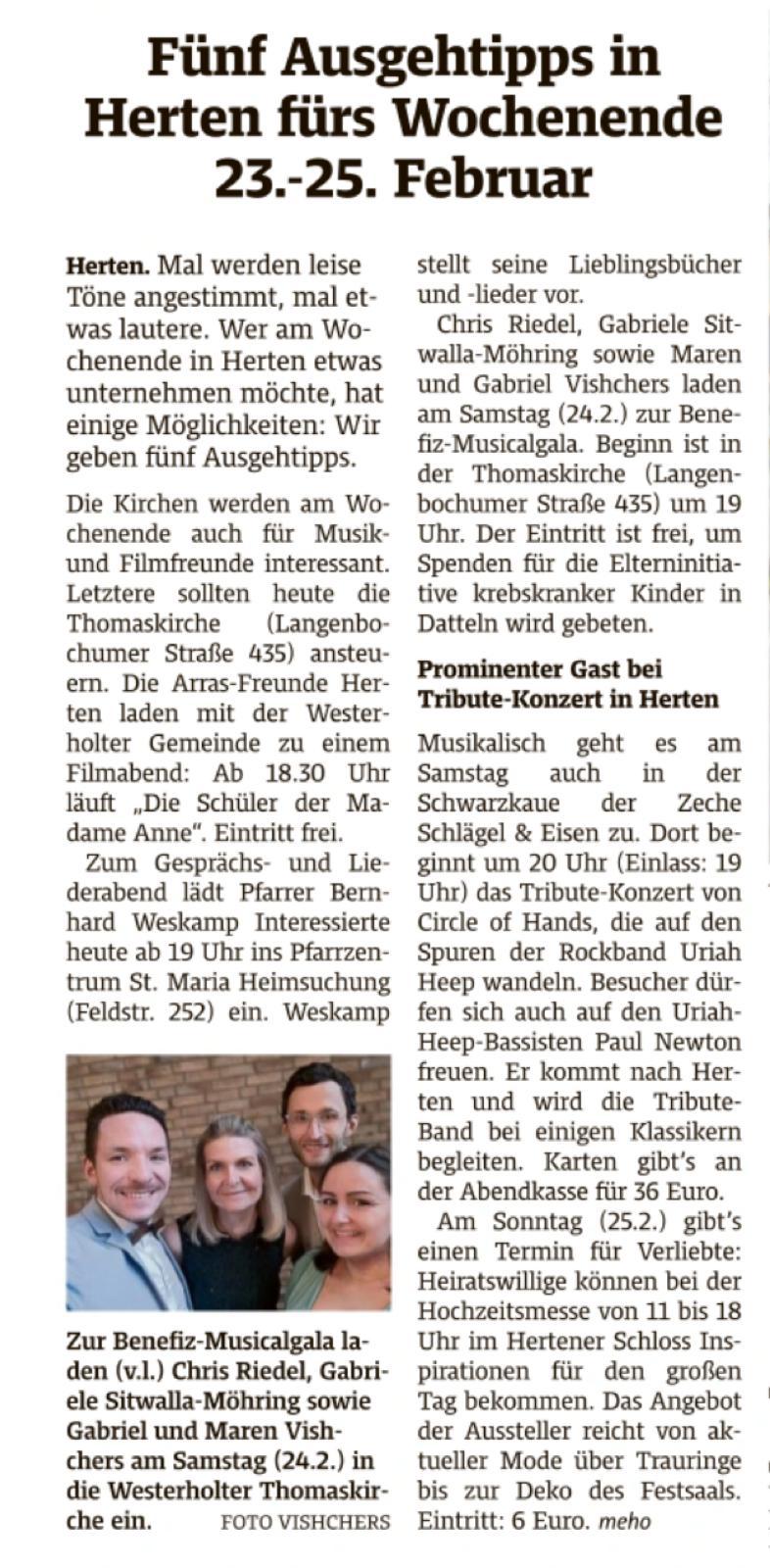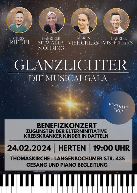 Die Veranstaltung dient einem guten Zweck: "Glanzlichter" ist ein Benefizkonzert zugunsten der Elterninitiative Krebskranker Kinder in Datteln. Der Eintritt ist frei, aber wir laden Sie herzlich dazu ein, die Elterninitiative durch Ihre großzügigen Spenden zu unterstützen. Wir freuen uns auf Sie!
